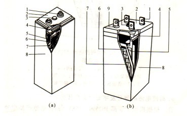 ?。币唤泳€端子;2一蓋;3~安全閥;4一極柱;5一正極板;6一隔板;7一負(fù)極板;8--#b.殼;9一端子膠