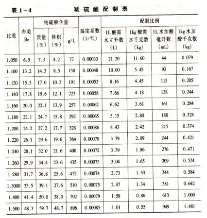 制取純水的方法有蒸餾法、陰陽(yáng)樹(shù)脂交換法、電阻法、離子交換法等。因水中的雜質(zhì)是鹽類離子,所以水的純度用電阻率來(lái)表示。國(guó)內(nèi)制造廠主要用離子交換法制取。其總含鹽量小于lm9/l,水電阻率為(80~1000)×104Ω.mm(25 0C)。鉛酸電池電解液(稀硫酸)配制見(jiàn)表l-4。濃硫酸加入水稀釋,會(huì)發(fā)生體積收縮,故混合體積值應(yīng)適當(dāng)增大。