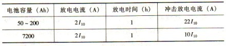 1)100%容量沖擊電流放電能力。當蓄電池容量達到滿容量時,對容量為50~200Ah的電池用25I10沖擊電流值,容量大于200Ah的電池用20I10沖擊電流值,沖擊l0次,每次500ms的沖擊放電,每兩次放電時間問隔為2s,直流母線的電壓不得低于90%UN(UN為直流系統(tǒng)額定電壓)。