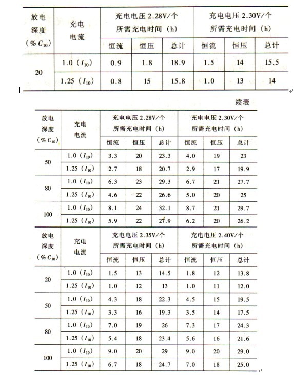 初充電一浮充電一均衡充電是按下列程序循環(huán)進(jìn)行的。在投運(yùn)前,對電池進(jìn)行初充電,此時用恒流為l.Oll0進(jìn)行充電。當(dāng)單體電池電壓上升到2.35V轉(zhuǎn)為恒壓充電,此時充電流逐漸減少,然后轉(zhuǎn)為正常運(yùn)行狀態(tài)即浮充電壓為2.25V。當(dāng)運(yùn)行720h后,進(jìn)行均衡充電,即先以恒流l.Ollo電池充電,至電池電壓為2.35V轉(zhuǎn)為恒壓充電,電壓恒定一段時間又轉(zhuǎn)為正常浮充狀態(tài)。當(dāng)交流電源中斷后,此時自動 進(jìn)行均衡充電,以恒流l.Ol】o充電。電池電壓上升至2.35V后和上述運(yùn)行初充后均衡充電的過程相同。上述兩階段充電,其浮充轉(zhuǎn)均充的判斷大多采用時間來整定,即不論放電幅度如何,一日由恒流階段轉(zhuǎn)入恒壓階段后,延時若干個小時,則自動轉(zhuǎn)為浮充。實(shí)際情況是充電所需時間與放電幅度有關(guān),如圖3-1所示。因此事故放電的深度是隨機(jī)的,若用一個固定的時間來操作,則有可能造成電池的過充或欠充,所以采用蓄電池回路的充電電流作為均充終期的判據(jù)是較合理的。不同放電深度后充電的所需時間見表3-1。表3-1 不同放電深度后充電所需時間