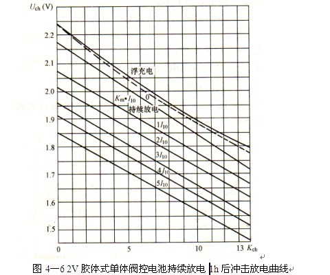 圖4—5~圖4—7中,浮充電曲線是指電池與充電裝置并聯(lián)運(yùn)行時(shí),承受短時(shí)間沖擊放電電流時(shí)蓄電池的端電壓,其中實(shí)線為電池未脫離浮充系統(tǒng)的端電壓,虛線為電池剛脫離浮充系統(tǒng)的電壓,持續(xù)放電曲線是指不同放電電流時(shí),承受第三時(shí)間沖擊放電的電壓變化曲線,沖擊放電曲線的沖擊時(shí)間為10~15s。曲線中“0”曲線是電池完全充足電后,脫離充電系統(tǒng),待電池電壓下降且穩(wěn)定在2.06~2.IOV/個(gè)時(shí),進(jìn)行沖擊放電的電壓變化曲線。