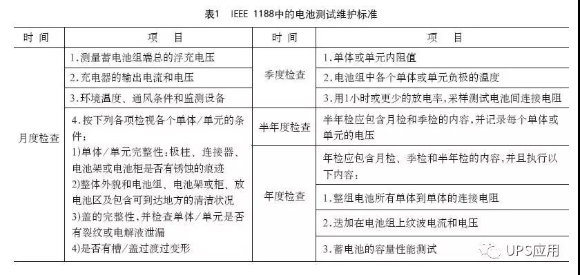 第二個(gè)問題使用維護(hù)的問題,表1為國際電池測試維護(hù)標(biāo)準(zhǔn)。