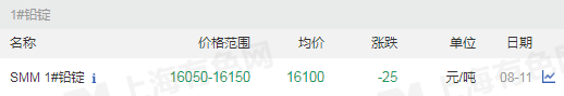 8月11日 周二   鉛價(jià)漲-25元/噸,均價(jià)16100元/噸