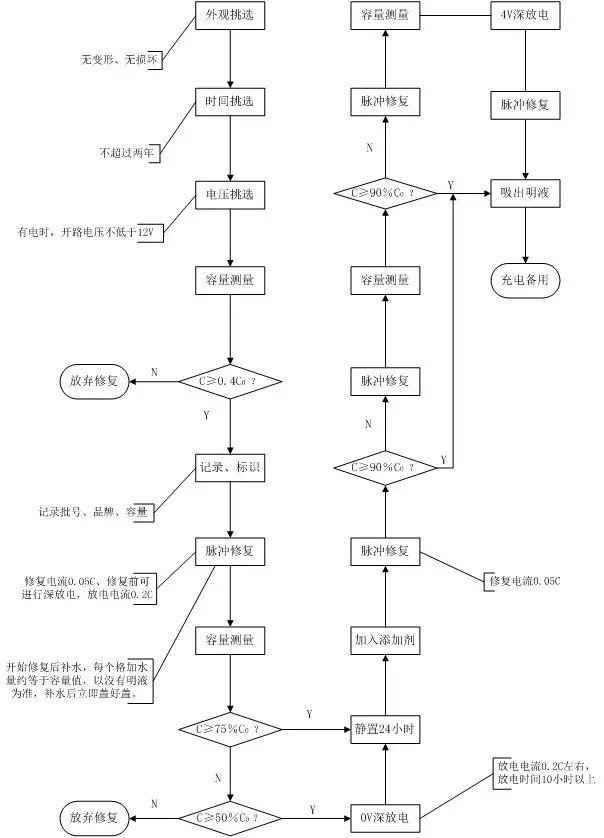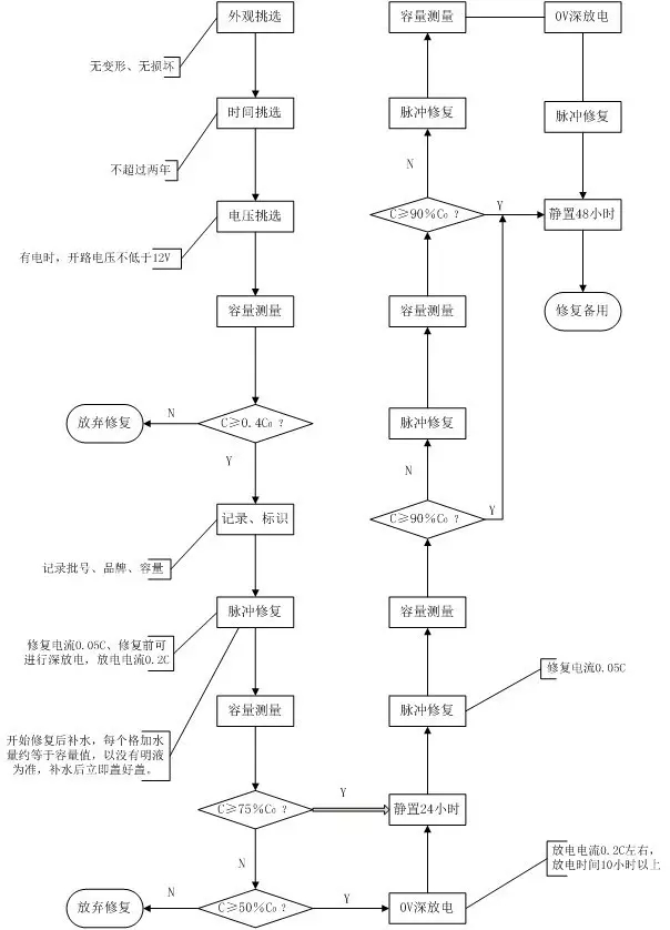 (3)容量不低于額定容量的40%,容量低于額定容量40%的電池,修復(fù)后難以達(dá)到理想容量值。