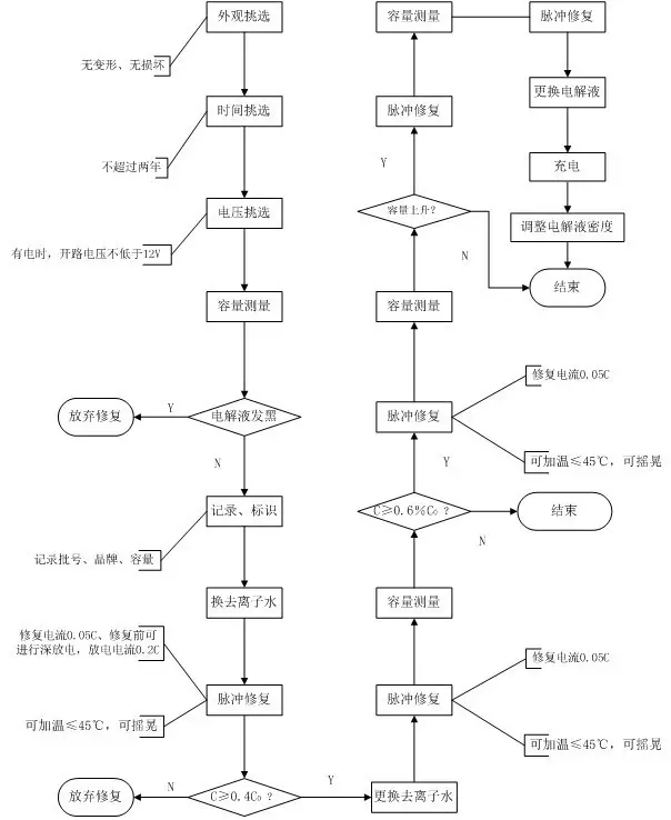 使用添加劑的修復(fù)流程如圖3;開(kāi)口蓄電池可以采用水療法修復(fù),其流程如圖4所示。